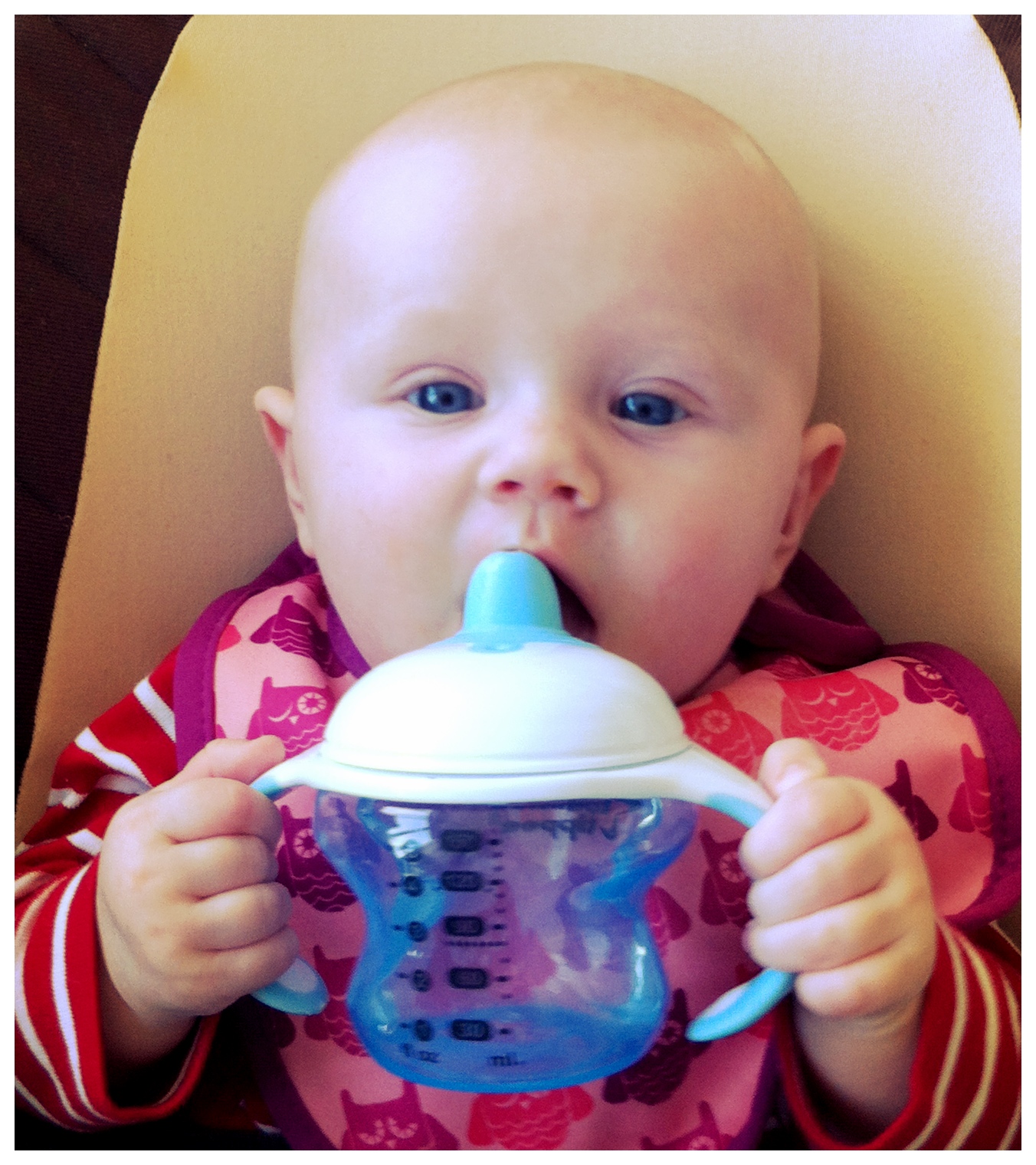 I går fikk hun litt gulrotpure på ettermiddagen og drakk litt vann fra egen kopp for første gang. Hun var veldig fornøyd 🙂